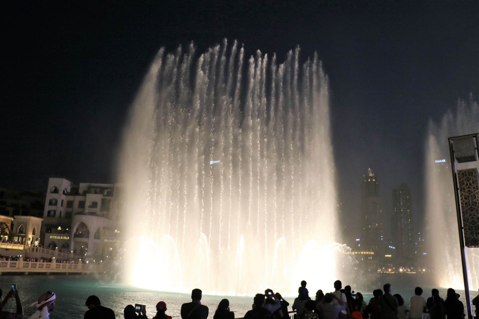 Am Fuß des Burj Khalifa findet mehrmals täglich eine kostenlose Attraktion von Downtown Dubai statt: die Wasserspiele von Dubai, beziehungsweise die Dubai Fountain / ʘ Show. Rund 6.600 Lichter, sowie verschiedene Bild- und Farbprojektoren, illuminieren die Wasserfontänen, die bis zu 152 Meter in die Luft schießen. Passende Musik untermalt das beeindruckende Schauspiel rund um den künstlich angelegten Burj Khalifa Lake.