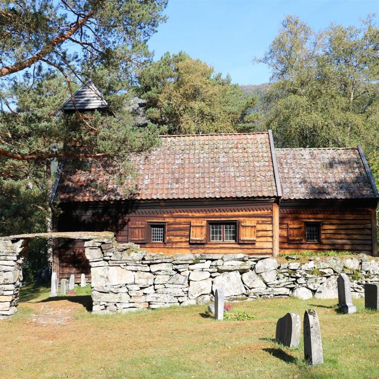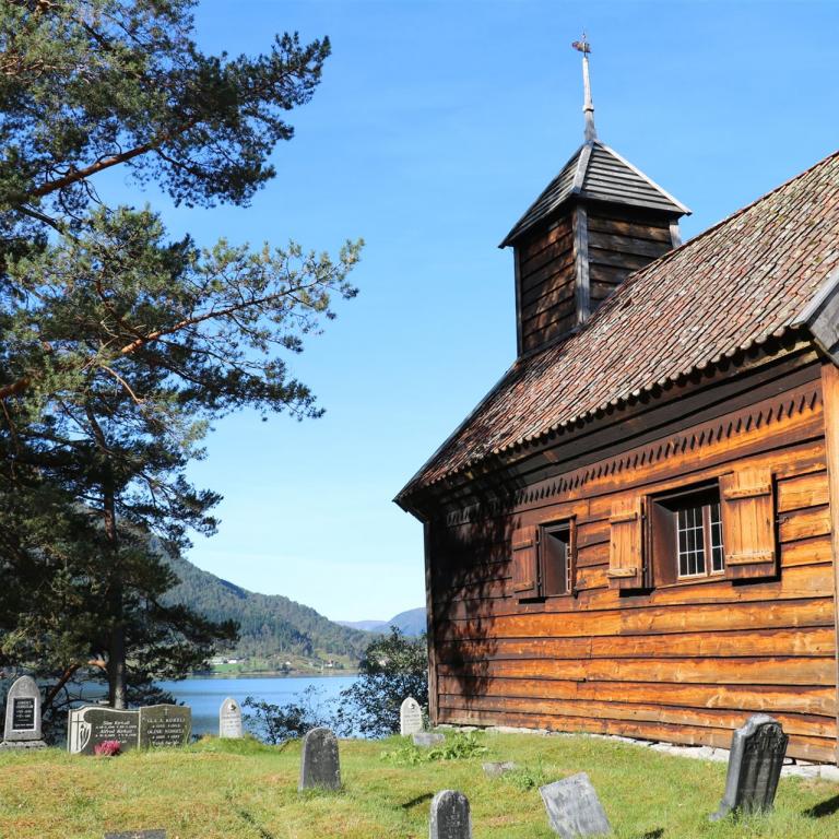 Die Kapelle Hestad / ʘ befindet sich auf einer Landzunge zwischen Viksdalsvatnet und dem Hestadfjord.