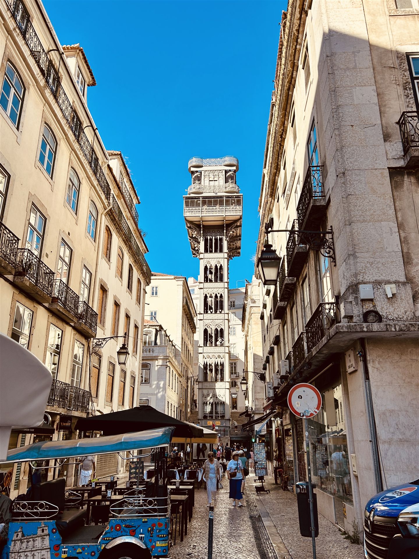Mitten in der Stadt steht ihr plötzlich vor dem Elevador de Santa Justa / ʘ. Die 45 Meter hohe Stahlkonstruktion ist nicht etwa ein Denkmal oder eine künstlerisch wertvolle Skulptur. Nein, sie ist ein Fahrstuhl, der den unteren Stadtteil Baixa mit dem höher gelegenen Stadtteil Chiado verbindet. Seinen Dienst tut er bereits seit 1902 bis heute.