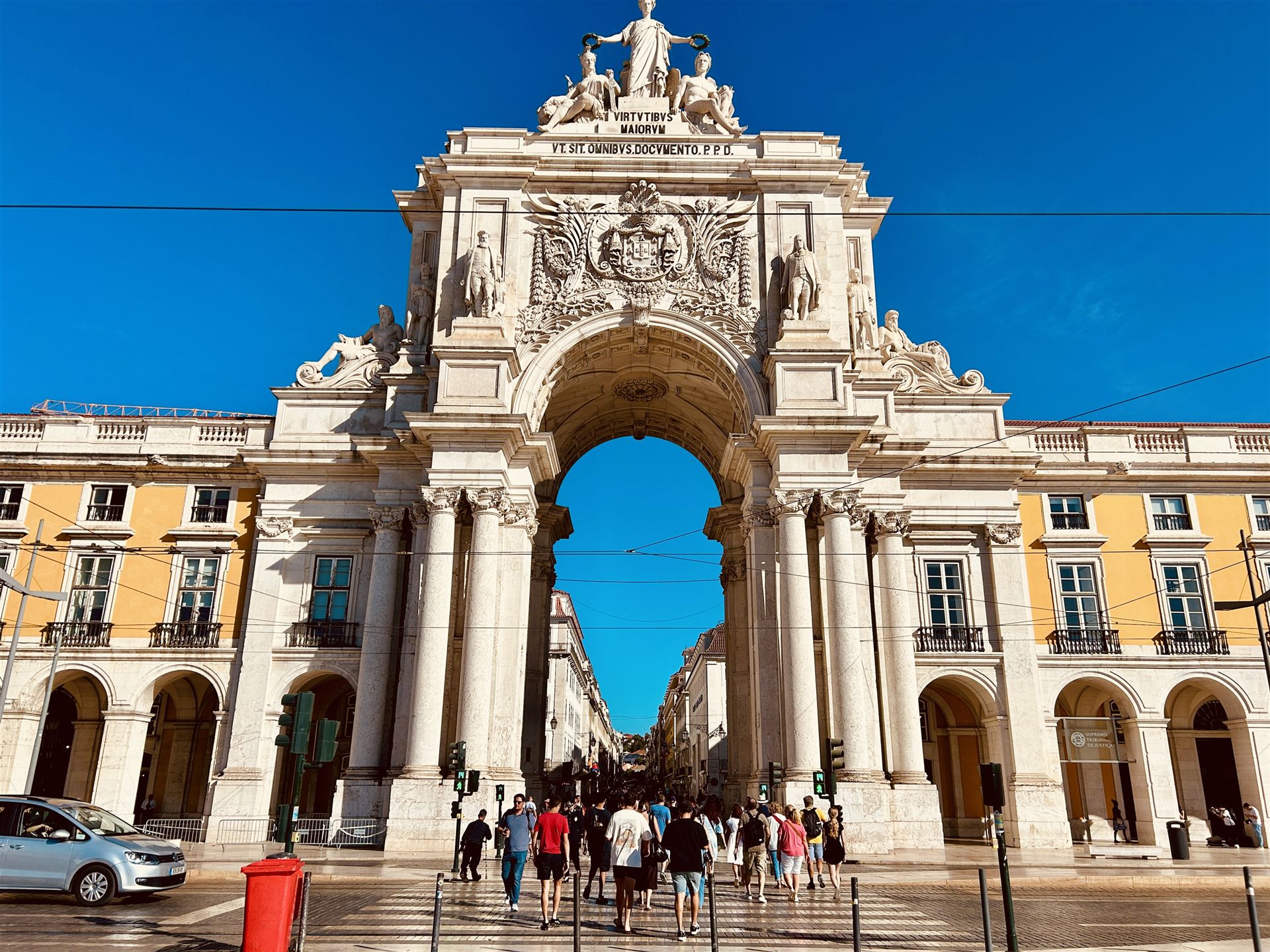 Am Ende der Rua Augusta mit ihren kunstvollen Fassaden, trifft man durch einen prächtigen Triumphbogen Arco da Rua Augusta / ʘ auf den großen Platz mit Sicht auf den Tejo: Umrahmt ist der Platz von Palästen und in seiner Mitte befindet sich ein majestätisches Reiterstandbild: