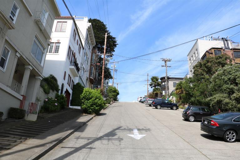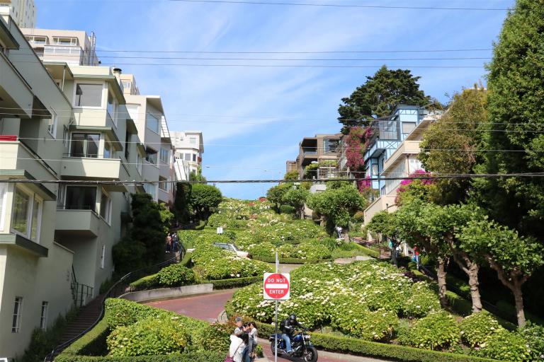 Die berühmte kurvenreiche Lombard Street / ʘ mit 8 Haarnadelkurven und einer Steigung von 21,3 Prozent. Die parallel verlaufende Filbert Street / ʘ ist jedoch noch steiler mit einer Neigung von 27%.