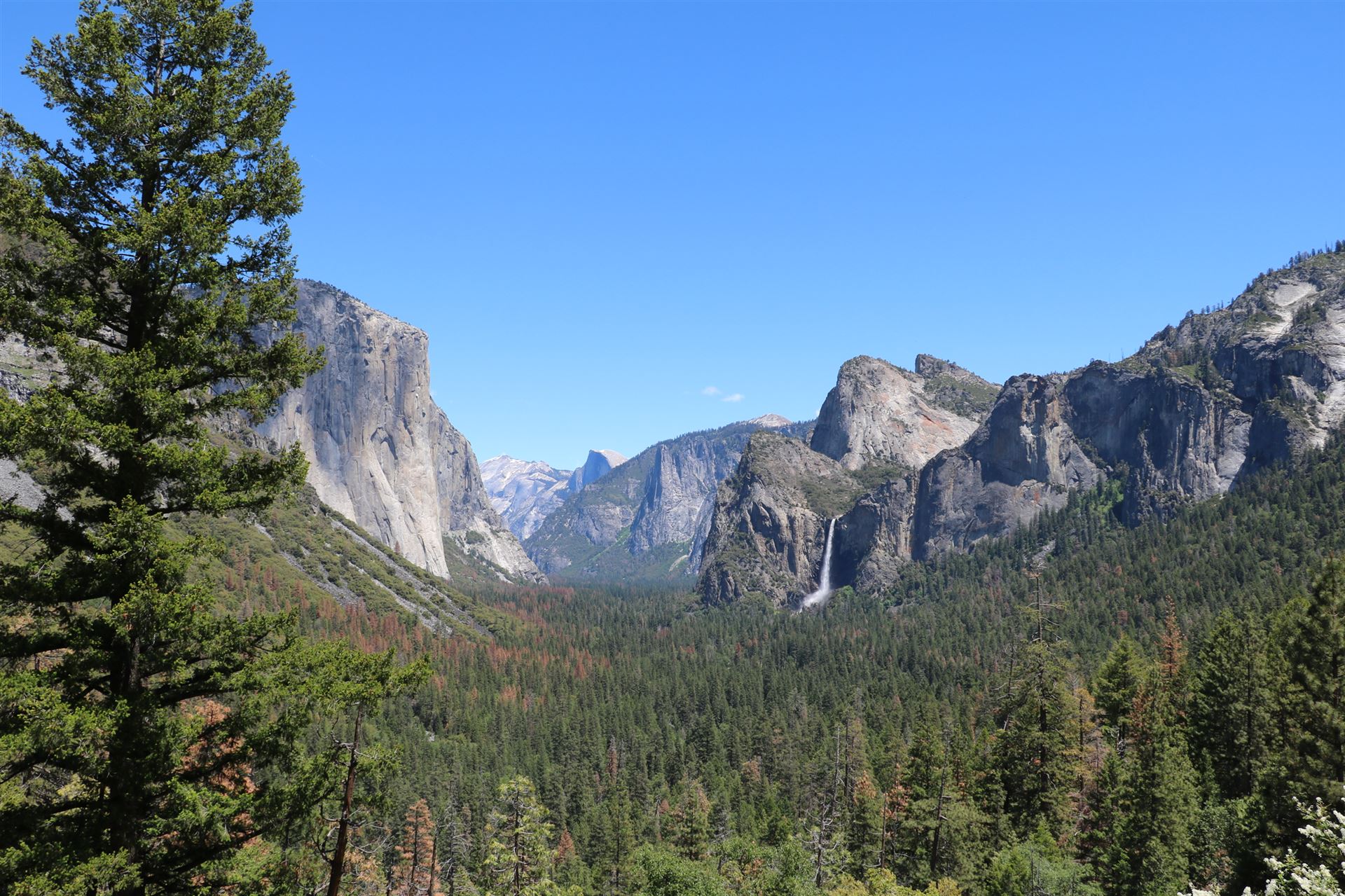Der El Capitan / ʘ ragt hinter dem Bridalveil Fall an der Nordseite des Tals empor. Diese 914 Meter hohe Steilwand aus Granit dominiert mit seiner markanten Form das gesamte Tal. Vom Sentinel Dome / ʘ hat man einen wunderschönen 360° Rundumblick.