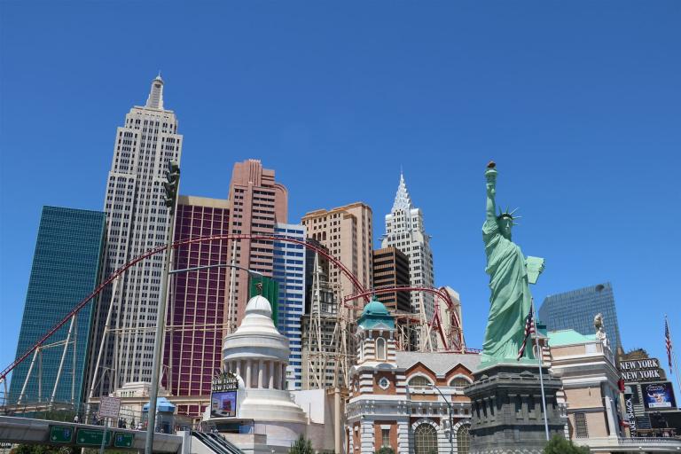 Paris Las Vegas / ʘ die französische Hauptstadt im Miniaturformat: Eiffelturm, Triumphbogen und Louvre sind auch vorhanden. Die Aussichtsplattform des Eiffel Tower Experience / ʘ gewährt einen fantastischen Ausblick über den Strip. Das ARIA / ʘ ist einer der neuesten Hotelkomplexe auf dem Strip, moderne Eleganz aus Glas und Stahl, hochwertige Ausstattung und nachhaltiger Umgang mit den Ressourcen. Das New York-New York / ʘ wurde mit der der Außenfassaden, in Anlehnung an die New Yorker Skyline, nachgebildet. Der The Big Apple Coaster / ʘ , eine Achterbahn windet sich um das Hotel. Die Achterbahn um das Hotel steigt bis zum 20 Stockwerk hinauf, geht über die Autobahnauffahrt und einmal um das Gebäude. Tickets.