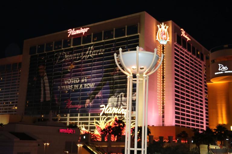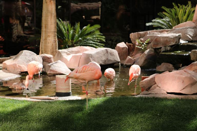 Das Flamingo / ʘ hat eine der schönsten Poolanlagen in Las Vegas. Die Landschaft um das Hotel ist 61.000 m² groß und im karibischen Stil angelegt. Inmitten der Anlage befindet sich ein Flamingo-Gehege. Das Caesars Palace / ʘ war das erste Themenhotel am Strip. 1966 im römischen Stil erbaut, beheimatet es das „Colosseum“ sowie die Einkaufsmeile „Forum Shops“. Das Bellagio / ʘ und die Fountains of Bellagio / ʘ die mehrmals täglich ein Lichtspielen umrahmtes Wasserballett aufführen. Bellagio Conservatory & Botanical Gardens - Ein riesiger Wintergarten, der mehrfach im Jahr umgestaltet wird. Mit viel Liebe zum Detail immer entsprechend der Jahreszeit dekoriert, liegt dieser direkt hinter der Rezeption und ist rund um die Uhr geöffnet. Der Eintritt ist frei.