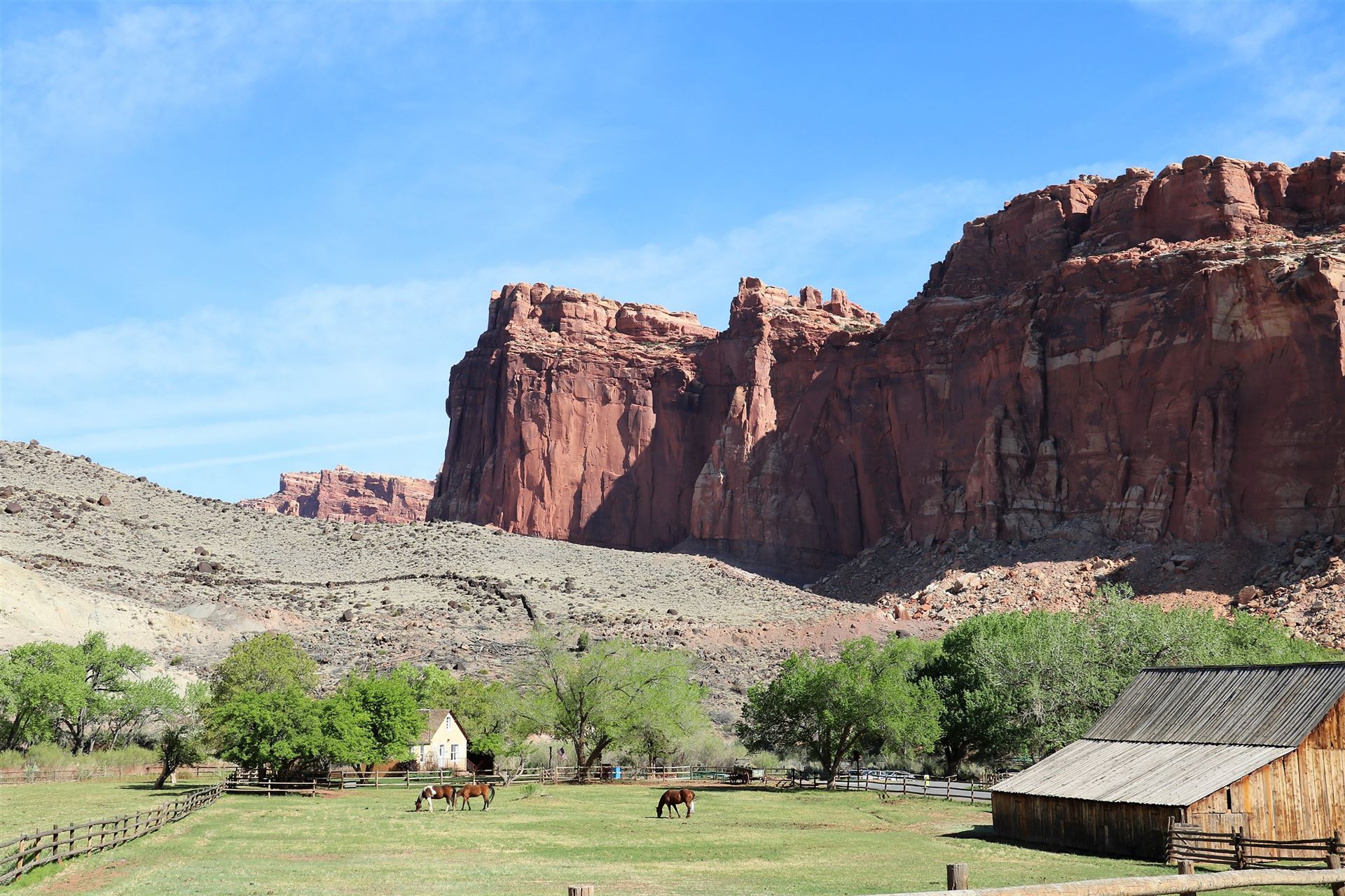 Das Steinhaus Behunin Cabin / ʘ wurde 1888 von einem Mormonen erbaut. An einem Steinmassiv haben vor ca. 900 Jahren sogenannte Fremont People Petroglyphs / ʘ Ritzzeichnungen im Felsen hinterlassen. Das Fruita Schoolhouse / ʘ wurde von Mormonen im Jahre 1896 gebaut. Acht Klassen mit insgesamt teilweise 26 Schülern wurden hier unterrichtet. Die mormonischen Siedler gründeten die Stadt Fruita / ʘ. Aus jene Tagen ist noch die Gifford Homestead / ʘ Farm, bestehend aus einem Bauernhaus und einer Scheune sowie Pferdekoppeln, erhalten.