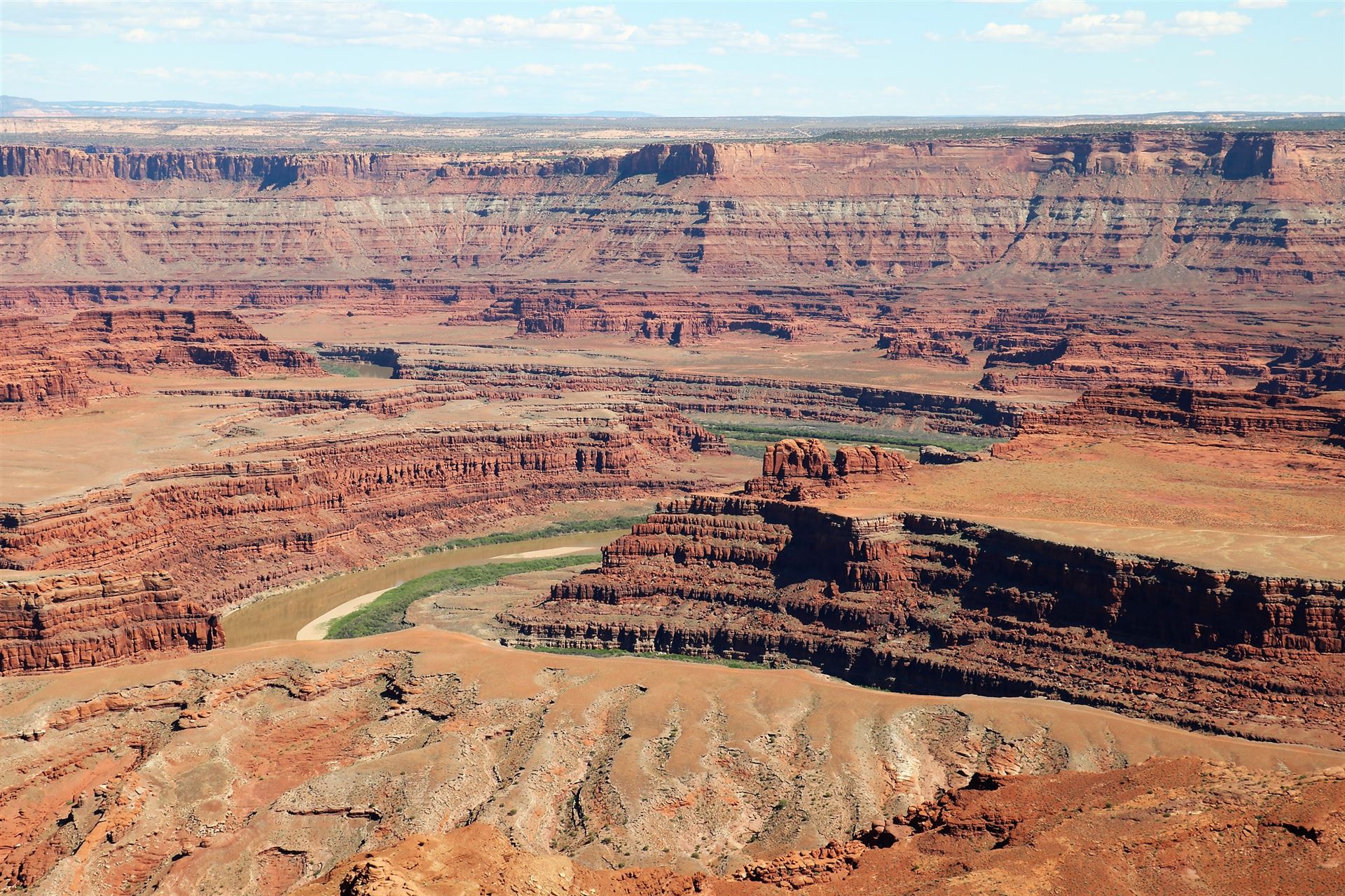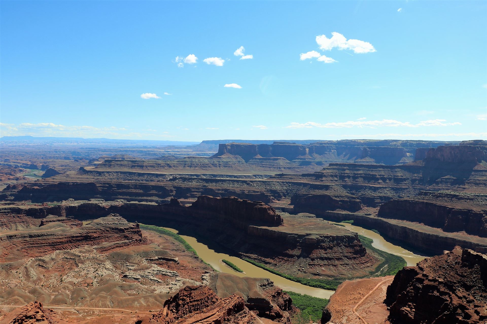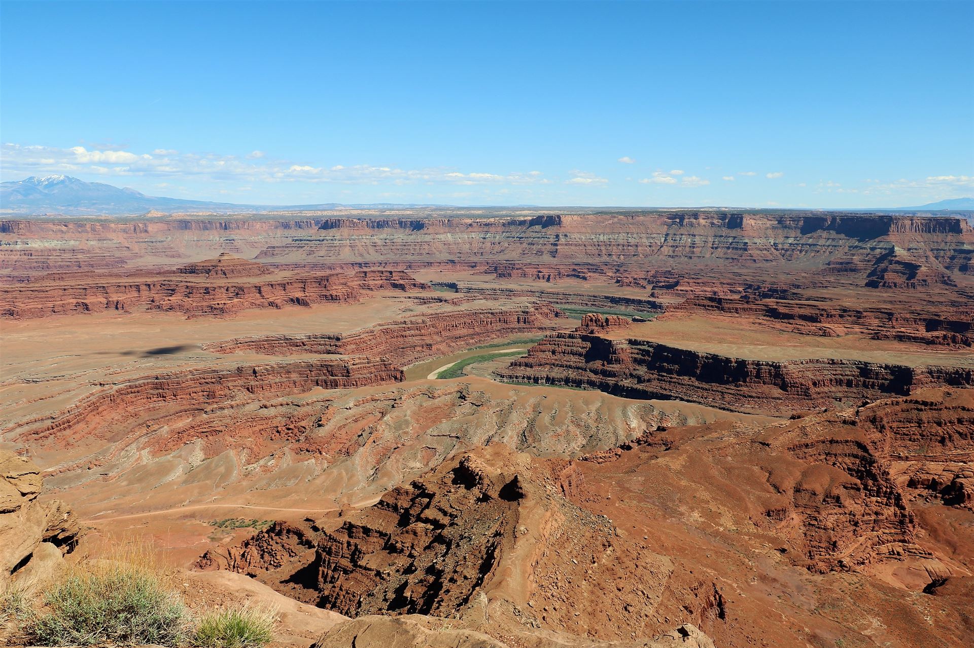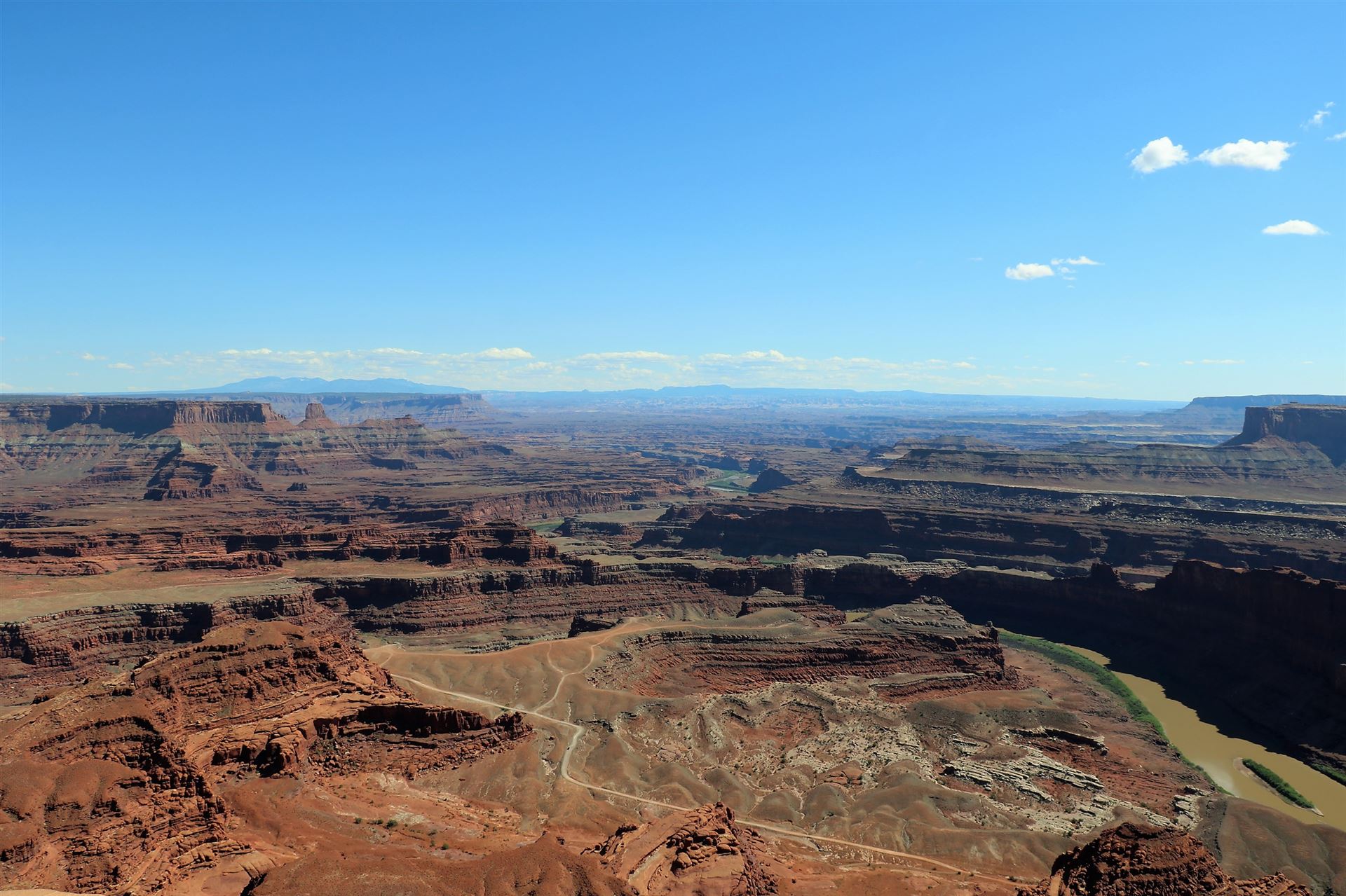 Der Dead Horse Point / Karte von wo man einen grandiosen Ausblick hat. Man befindet sich auf gut 1.800 m und blickt in die rund 500 m tiefe Schlucht, durch die sich der Colorado River schlängelt.